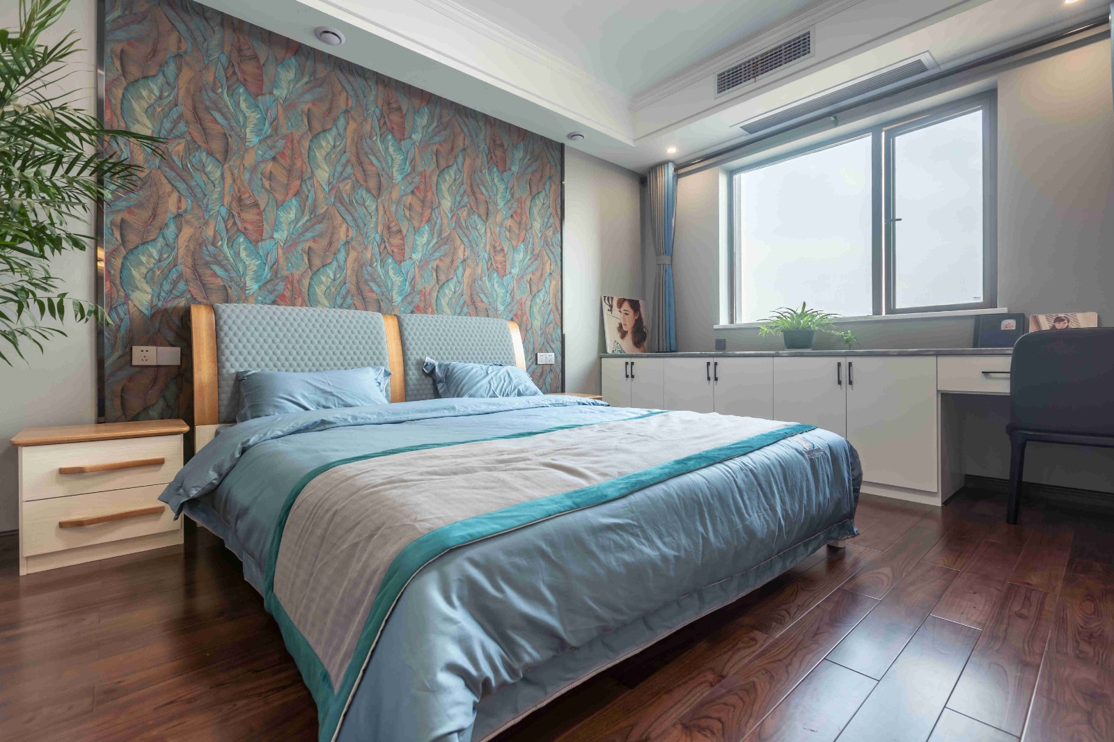在原戶型的基礎上,并沒有做太多的改動。靠窗增加了一排定制柜子,既能做梳妝臺又能放置東西。最引人注目的是床頭背景墻,充滿了藝術氣息,深邃幽遠。
