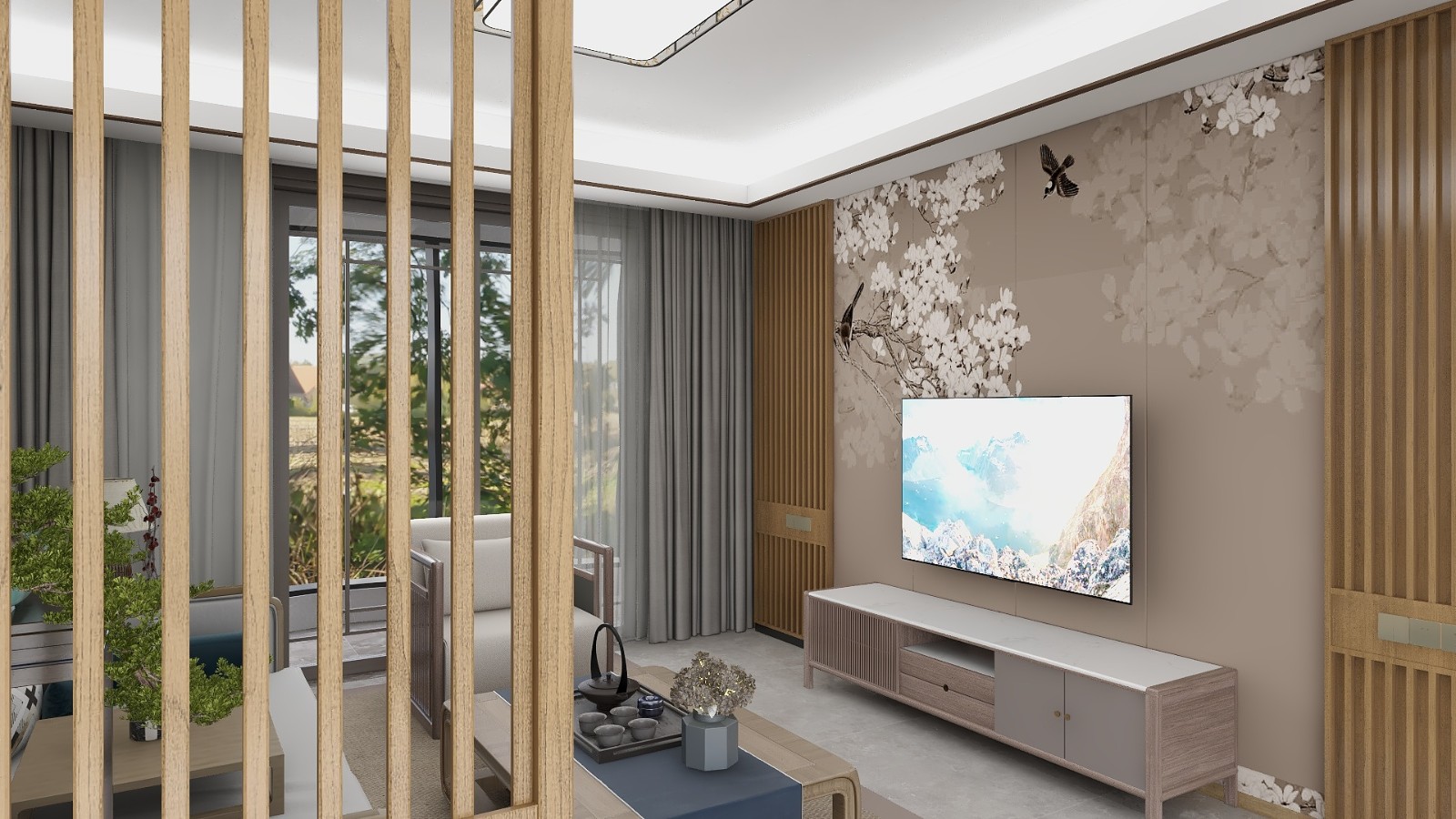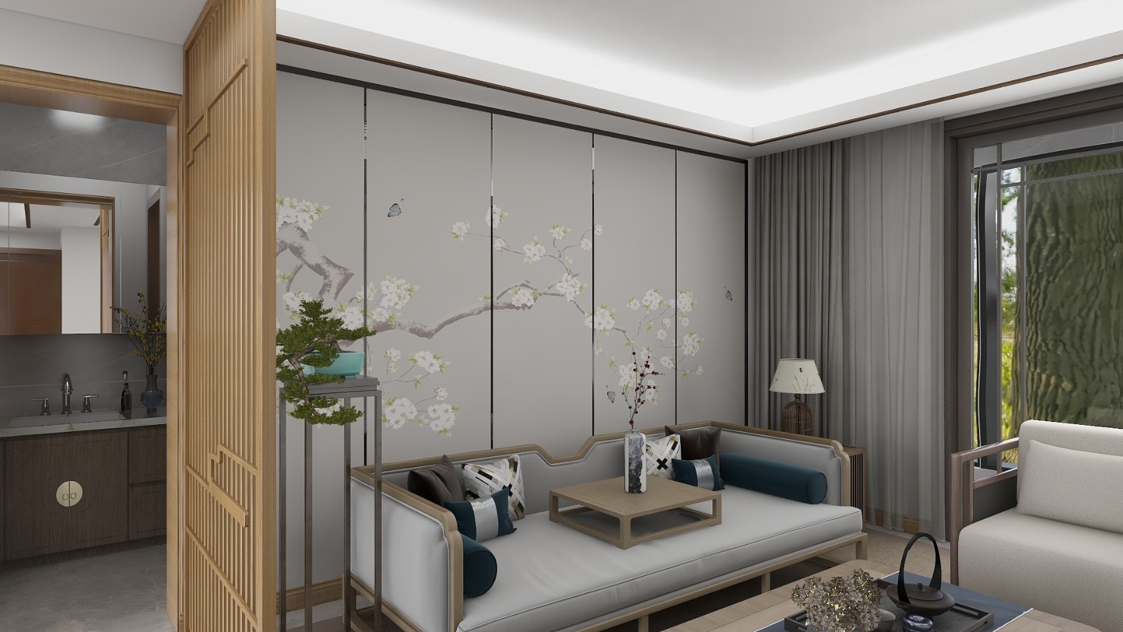 沙發背景墻融入了中式的意境與電視背景墻向虎銀,襯托出中式的韻味。